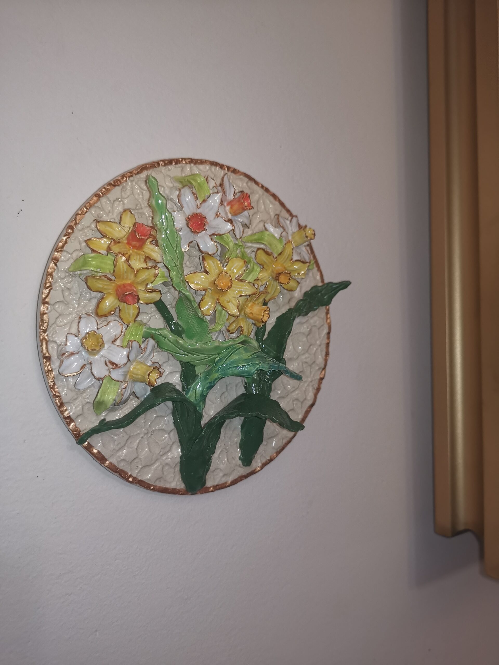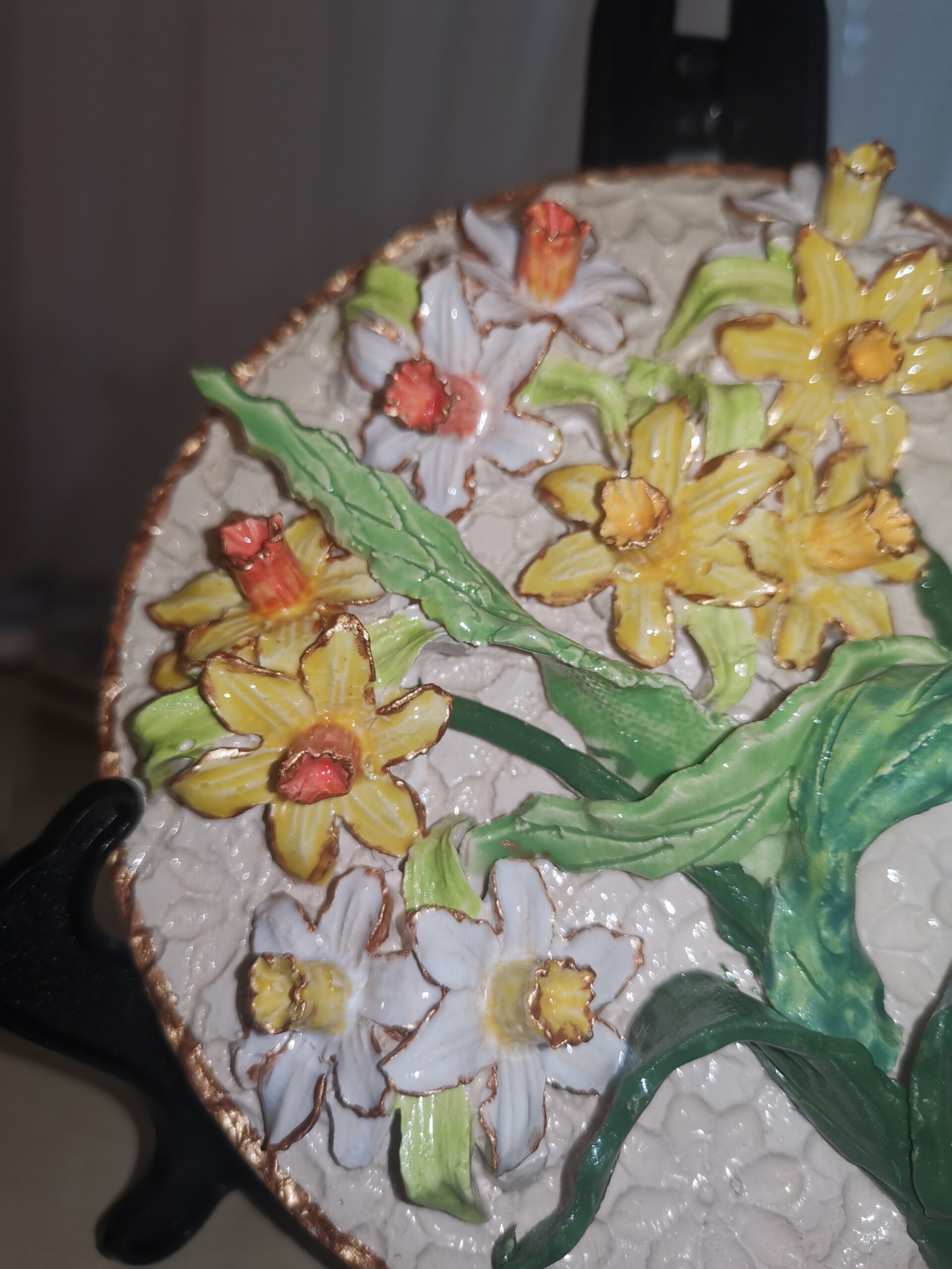 Daffodils 3D sculptural ceramic plate , Daffodils bouquet, handmade, Still life, wall decor.