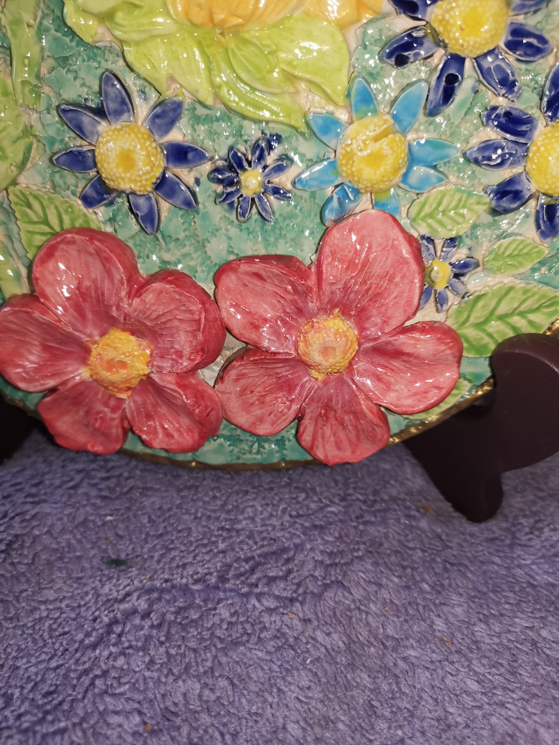 Sunflower daisieswild flowers bees and ladybugs ceramic panel, summer handmade, color therapy, Still life, Decorative art, colored ceramic.